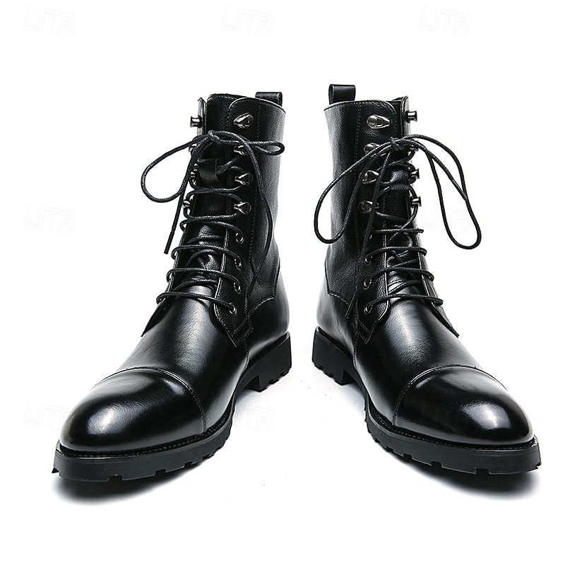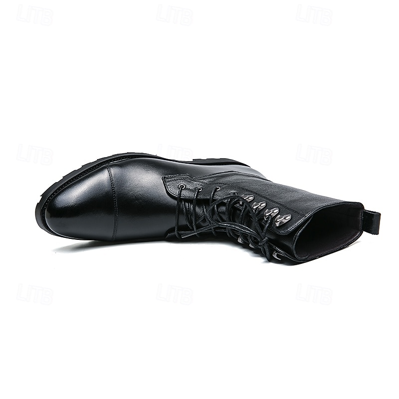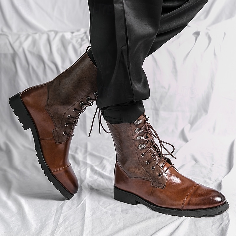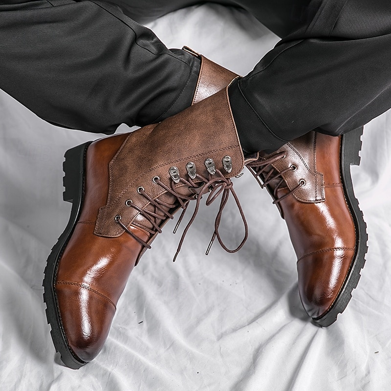 : Constructed from premium PU leather, these men's military boots blend a classic brown hue with a smooth polished finish on the lower half and a textured upper, creating an aesthetically appealing contrast. The rubber outsole ensures superior traction and slip resistance, making them suitable for various terrains.