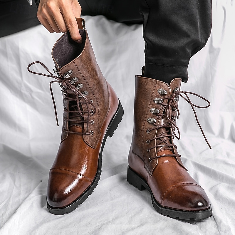 Men's Brown Faux Leather Military Boots with Lace-Up Design - Durable Ankle Boots for Outdoor Activities and Casual Wear