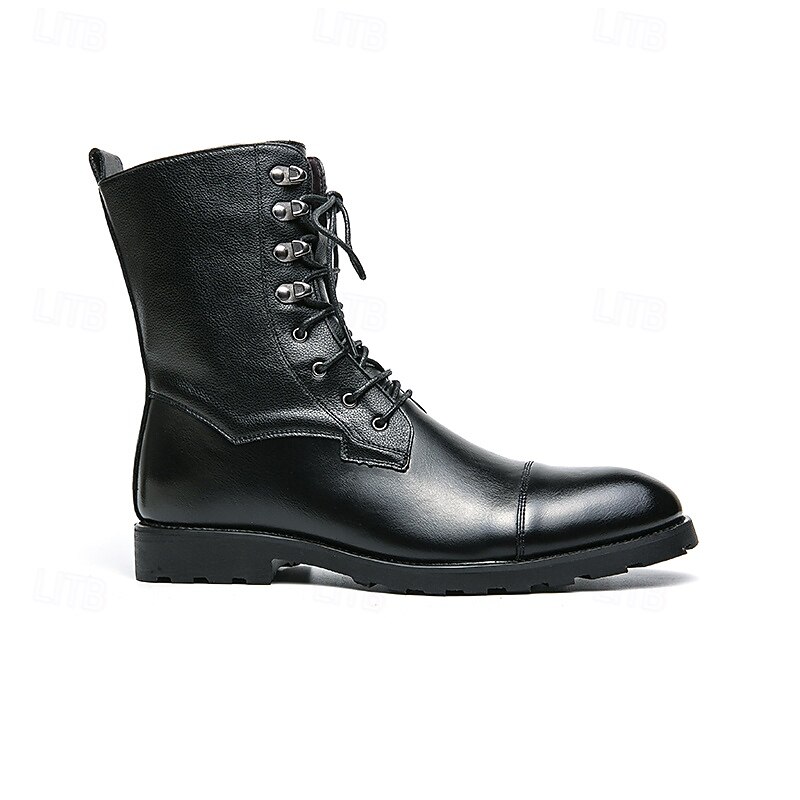 : Designed with a round toe, these boots offer both comfort and a timeless silhouette. The lace-up front with sturdy metal eyelets enhances both their style and functionality, while the reinforced stitching guarantees durability.
