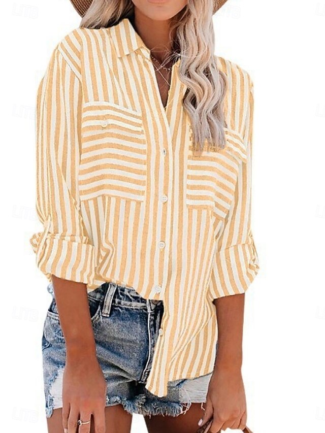HOT ! Women's Cotton Linen Shirts Striped Stylish Casual Long Sleeve Shirt Button Down Blouse Collar Regular Tops Daily Pocket Buttons Print Yellow Pink Blue Green Summer Spring Fall