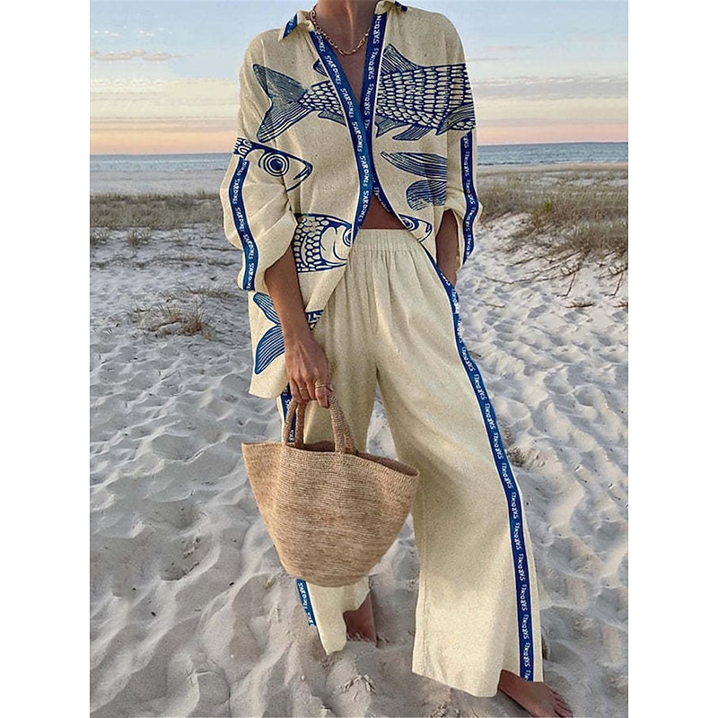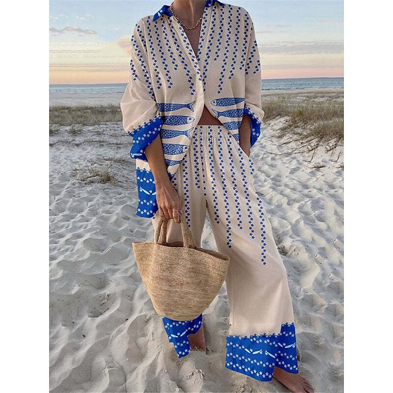 Women's 2 Pieces Fashion Streetwear Daily Pants Sets Long Sleeve Shirt Collar Graphic Casual Daily Beach Red Navy Blue Royal Blue Summer Regular Fit 2