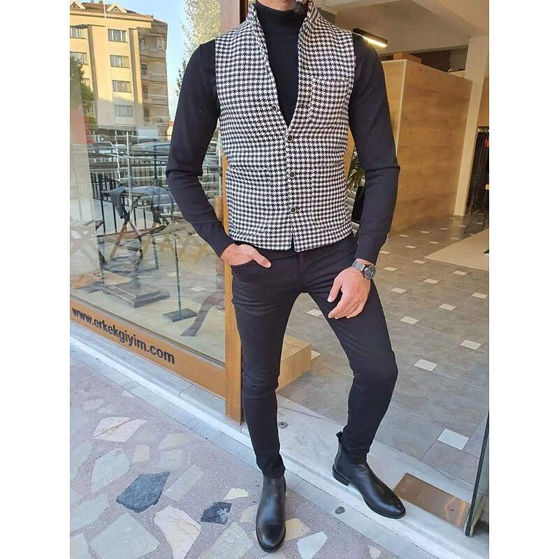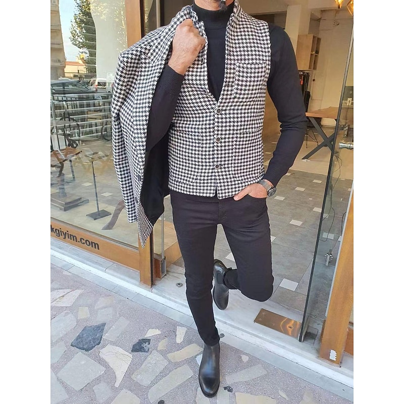 More information about Men's Vest Gilet Casual Daily Traditional Spring & Fall Basic Polyester Casual Houndstooth Single Breasted Standing Collar Form Fit Black Vest