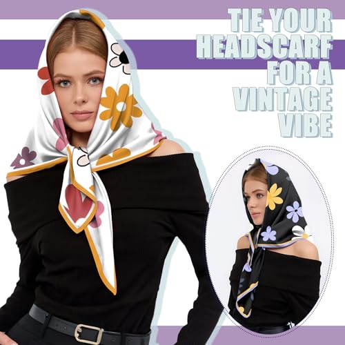 2PCS Scarf Silk Feeling Satin Head Hair Wrap Lightweight Large Square Fashion Cute Aesthetic 27.5 Inches for Women-Flowers 4