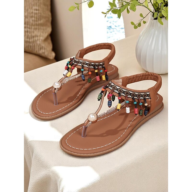 HOT ! Women's Boho Beaded T-Strap Sandals with Pearl Accent Colorful Flat Thong Sandals for Beach Vacations, Summer Festivals and Casual Outfits