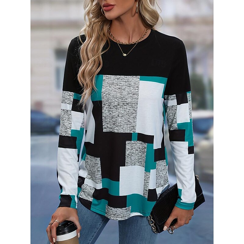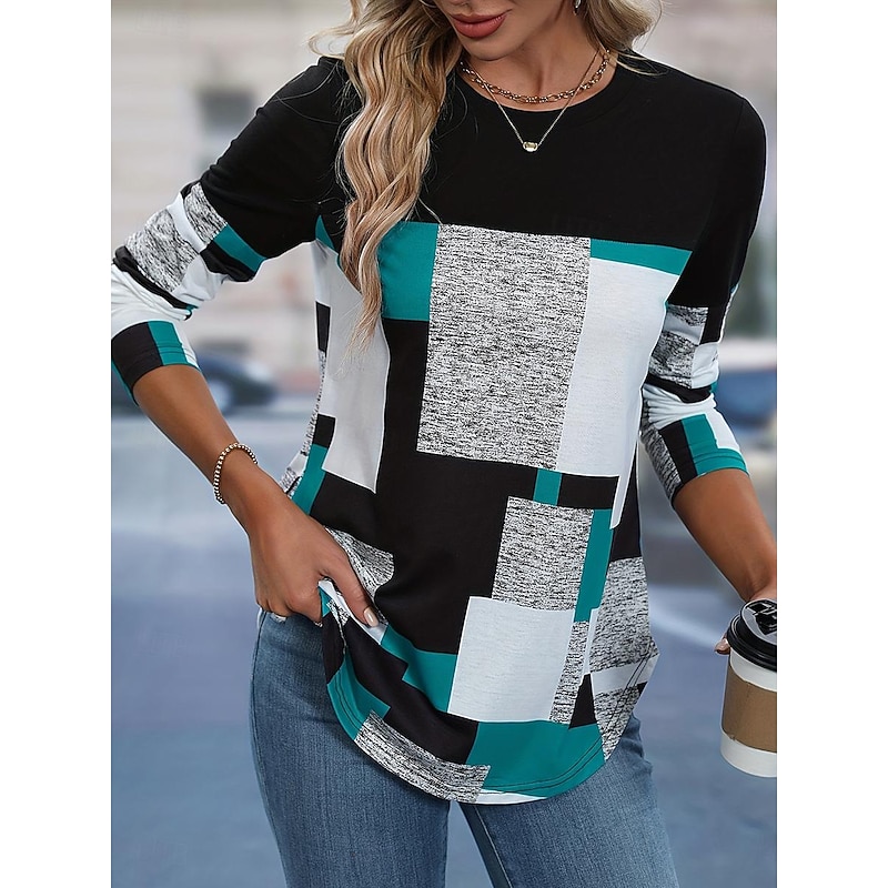 Highlights [Fabric] : Crafted from a high-quality polyester blend, this women's tunic offers a micro-elastic fit for added comfort, making it ideal for everyday wear throughout the spring and fall seasons. The fabric is soft against the skin and easy to care for, with the convenience of machine washing or dry cleaning. [Fit] : Featuring a regular fit with a crew neck, this tunic provides a classic silhouette that complements a variety of body types. Its long sleeves and regular length make it versatile and suitable for layering with other wardrobe staples. [Design Highlights] : The tunic showcases a striking color block pattern in black, white, and gray, accented by a bold striped print. This geometric design adds a modern touch to the top, ensuring it stands out as a stylish choice for any casual ensemble. [Occasions] : Perfect for casual daily wear, this tunic is versatile enough to be worn for various occasions, whether you're running errands, meeting friends for coffee, or enjoying a relaxed weekend at home. Pair it with jeans or leggings for an effortlessly chic look. [Size Range] : Available in a range of sizes from S to 2XL, this tunic accommodates different body measurements to ensure a comfortable and flattering fit for every wearer.