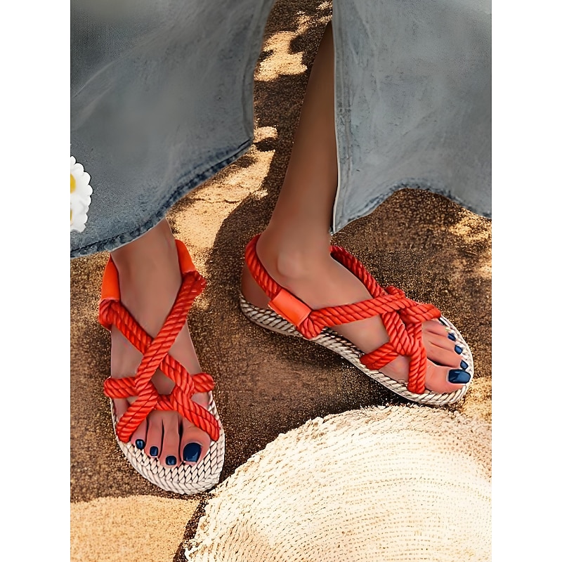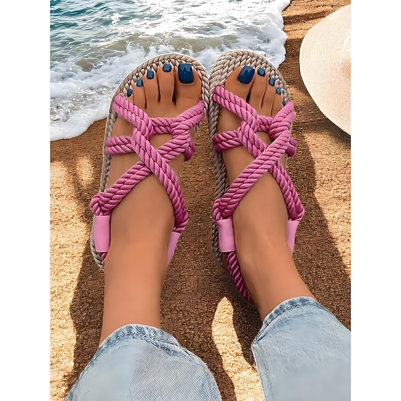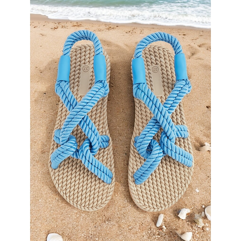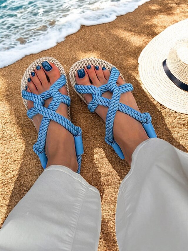 HOT ! Women's Blue Rope Sandals – Handmade Knotted Strappy Flat Sandals for Summer, Beach Vacations, and Casual Wear
