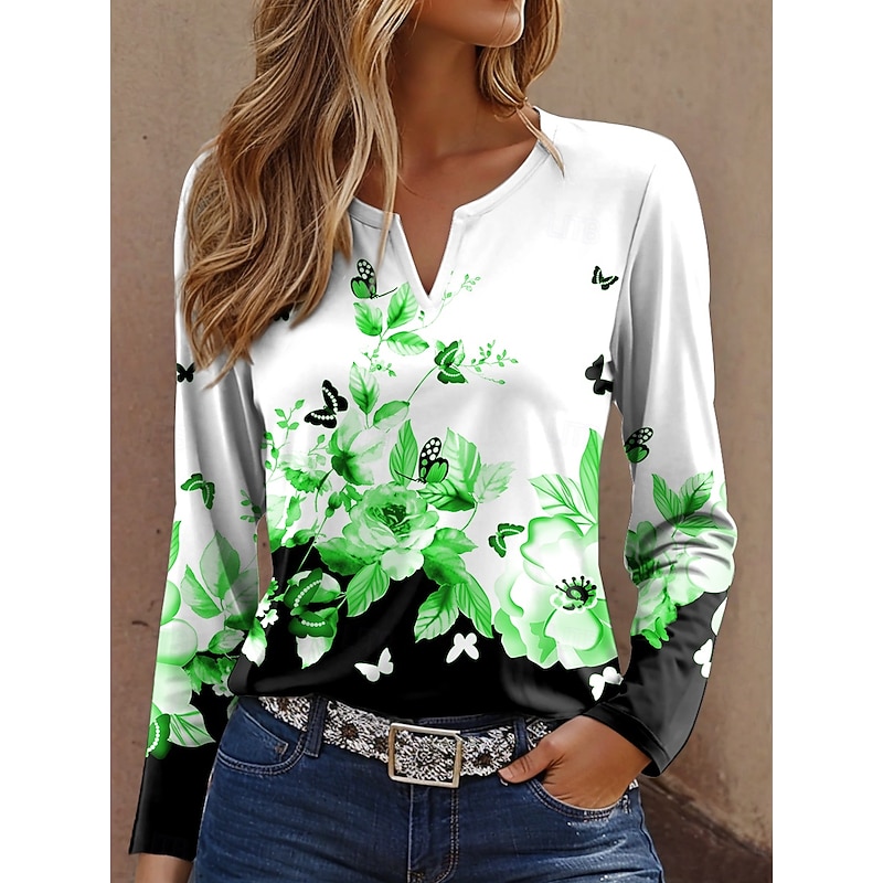 HOT ! Women's T Shirt Floral Graphic Vintage Stylish Casual Long Sleeve Notched Neck Regular Tops Daily Weekend Print White Red Blue Purple Green Spring Fall Winter