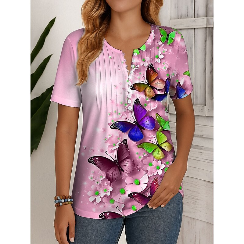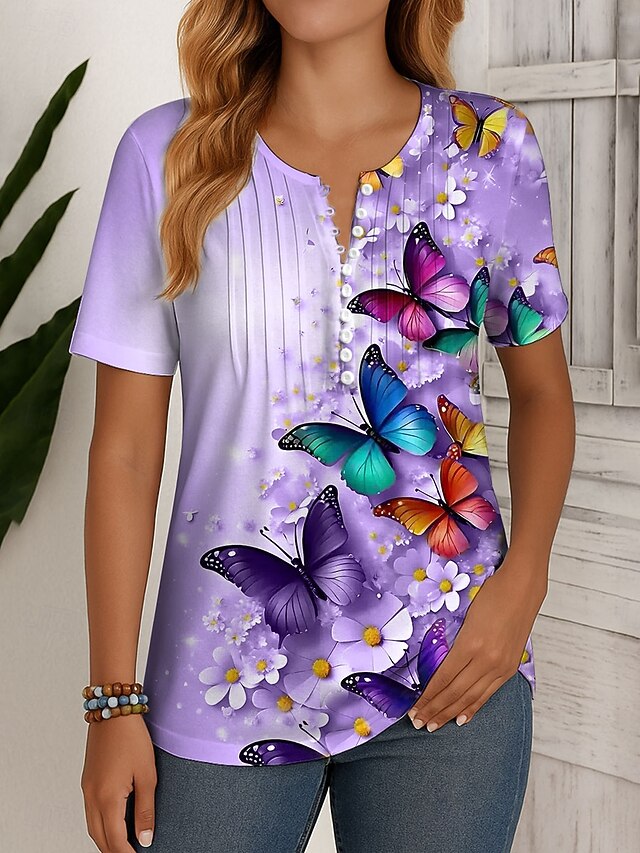 Women's T Shirt Ombre Floral Graphic Vintage Stylish Classic Short Sleeve Round Neck Regular Tops Daily Weekend Beach Wear Smocked Buttons Print Red Purple Green Summer Spring 8