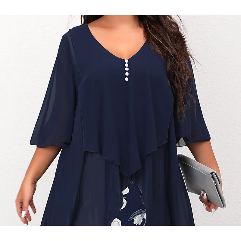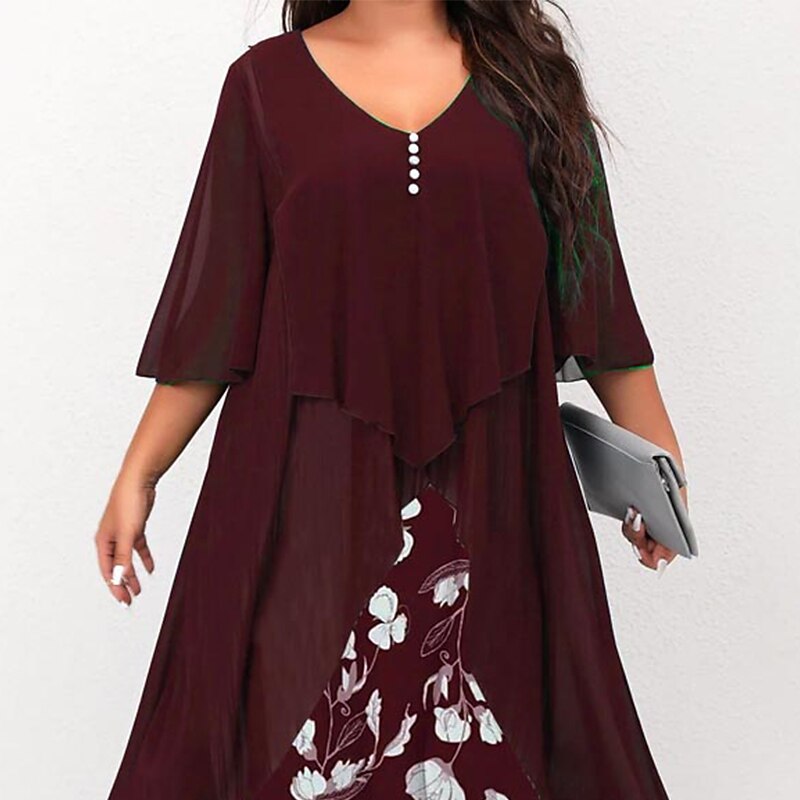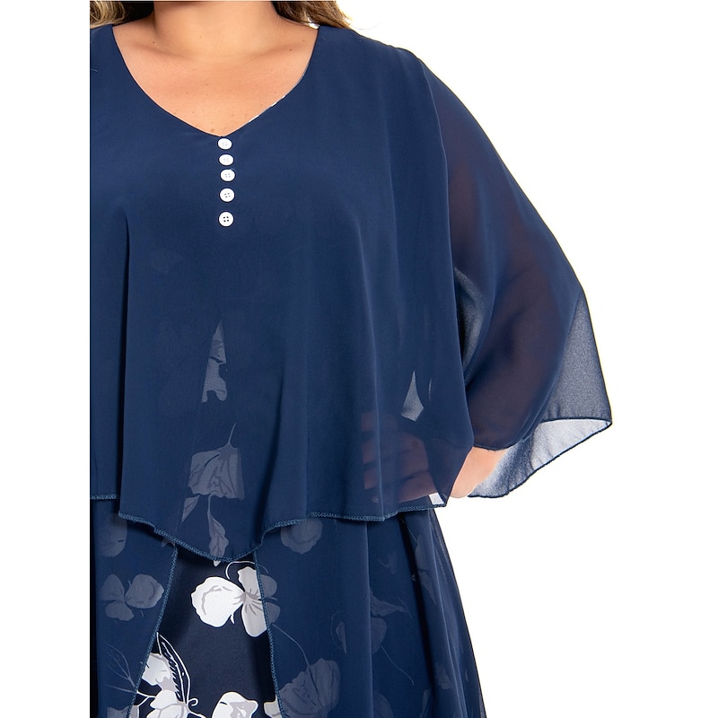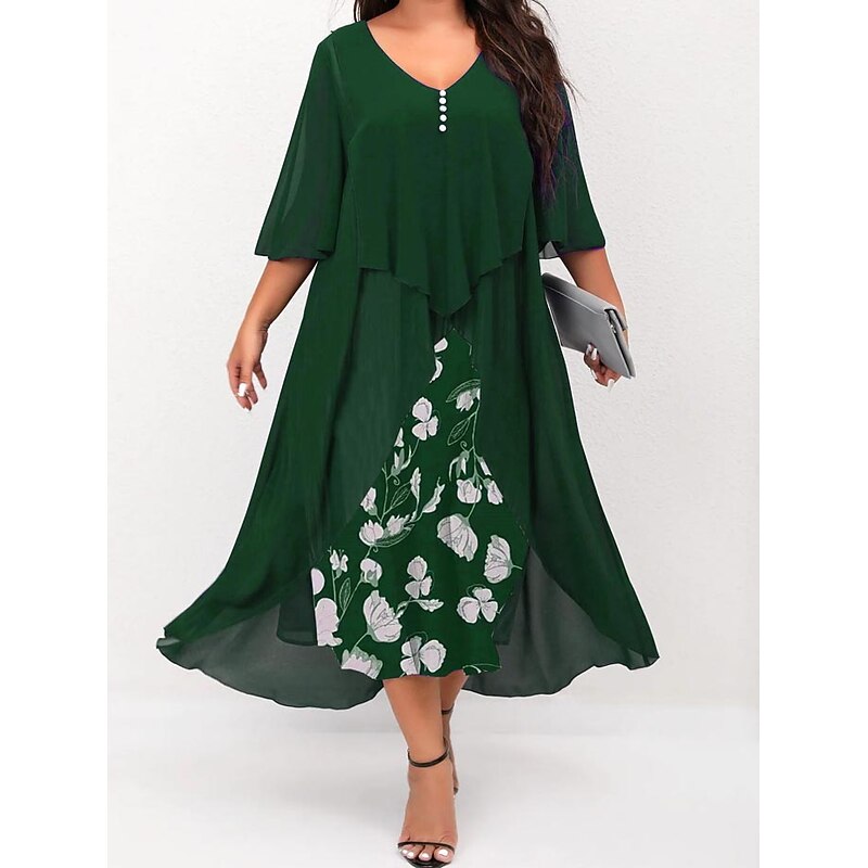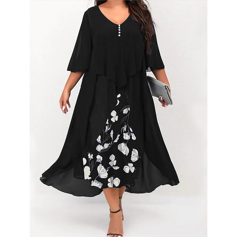Highlights [Fabric] : Crafted from soft and breathable polyester, this dress offers micro-elasticity for a comfortable fit that moves with you. The lightweight chiffon cape adds an airy layer for an elegant touch, ensuring you feel stylish and relaxed. [Silhouette] : The dress features a flattering A-line silhouette with a fitted bodice that complements a variety of body types. Falling just below the knee, it provides a timeless and versatile style that suits both formal and casual occasions. [Design Highlights] : With a sophisticated V-neckline and ruched 3/4 length sleeves, this dress showcases a vibrant floral print that pops against a dark background, offering a fresh and lively appearance. The layered design with a button-adorned chiffon cape adds classic charm and depth to the overall look. [Occasions] : Perfect for formal events, vacations, and work settings, this dress is versatile enough to transition from day to evening. Its combination of classic elegance and modern flair makes it an ideal choice for various events throughout the spring and summer. [Size Range] : Available in a range of plus sizes, including L, XL, XXL, 3XL, 4XL, and 5XL, this dress is designed to accommodate and flatter curvy figures, providing a comfortable and stylish option for women seeking both elegance and ease of wear.
