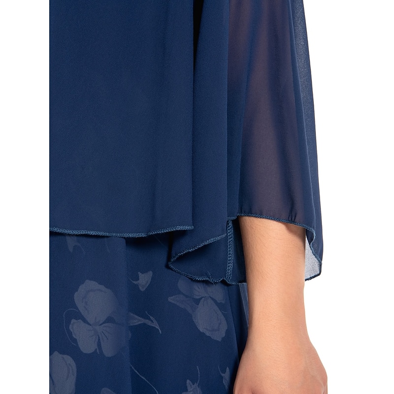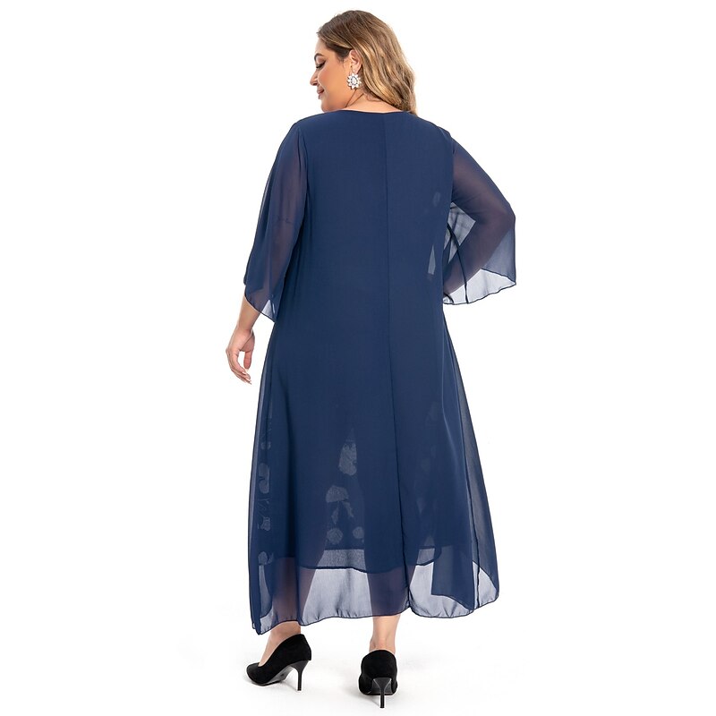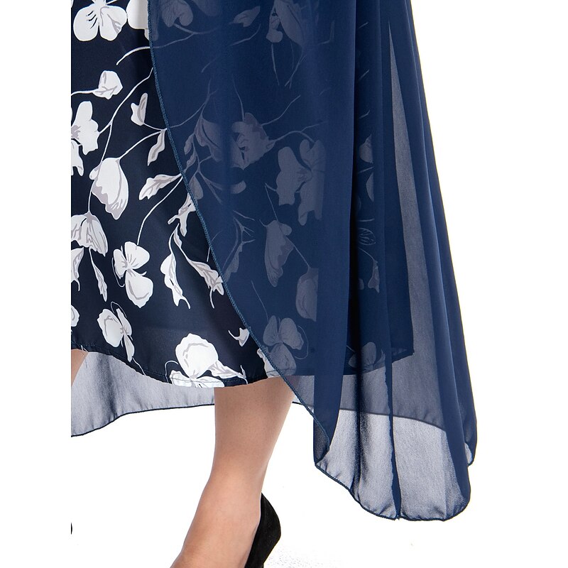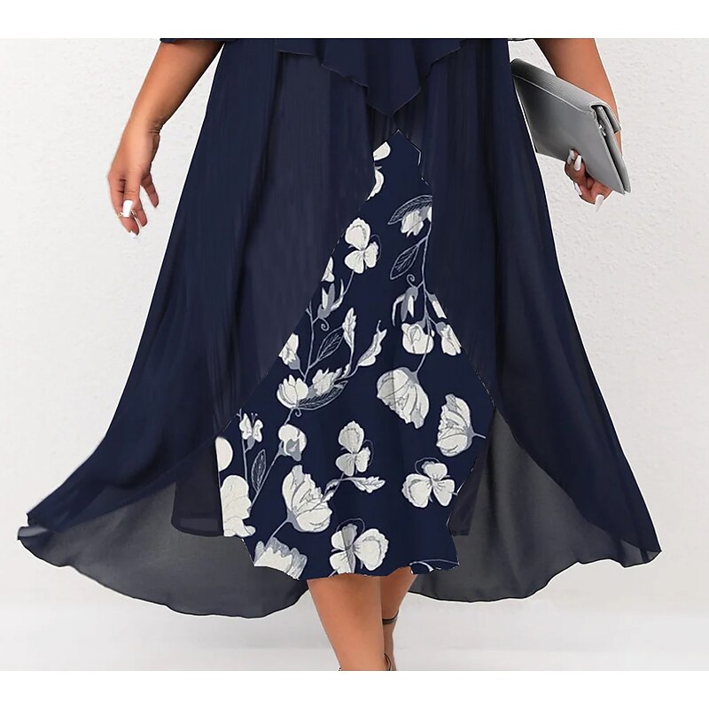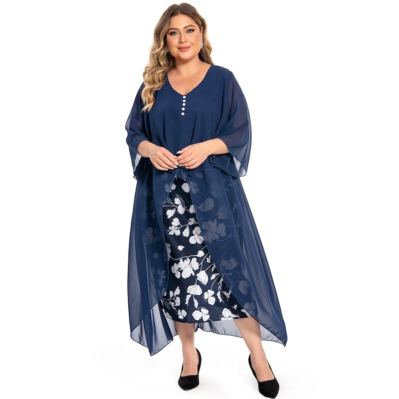 Highlights [Fabric] : Crafted from soft and breathable polyester, this dress offers micro-elasticity for a comfortable fit that moves with you. The lightweight chiffon cape adds an airy layer for an elegant touch, ensuring you feel stylish and relaxed. [Silhouette] : The dress features a flattering A-line silhouette with a fitted bodice that complements a variety of body types. Falling just below the knee, it provides a timeless and versatile style that suits both formal and casual occasions. [Design Highlights] : With a sophisticated V-neckline and ruched 3/4 length sleeves, this dress showcases a vibrant floral print that pops against a dark background, offering a fresh and lively appearance. The layered design with a button-adorned chiffon cape adds classic charm and depth to the overall look. [Occasions] : Perfect for formal events, vacations, and work settings, this dress is versatile enough to transition from day to evening. Its combination of classic elegance and modern flair makes it an ideal choice for various events throughout the spring and summer. [Size Range] : Available in a range of plus sizes, including L, XL, XXL, 3XL, 4XL, and 5XL, this dress is designed to accommodate and flatter curvy figures, providing a comfortable and stylish option for women seeking both elegance and ease of wear.