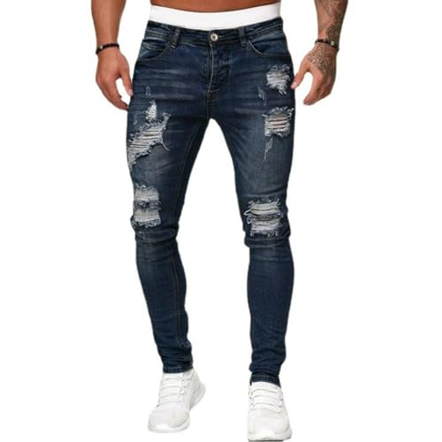 HOT ! Jeans Pants Trousers Denim Ripped Holes Street Trendy Washed Polished White Elastic Tight Fitting Men