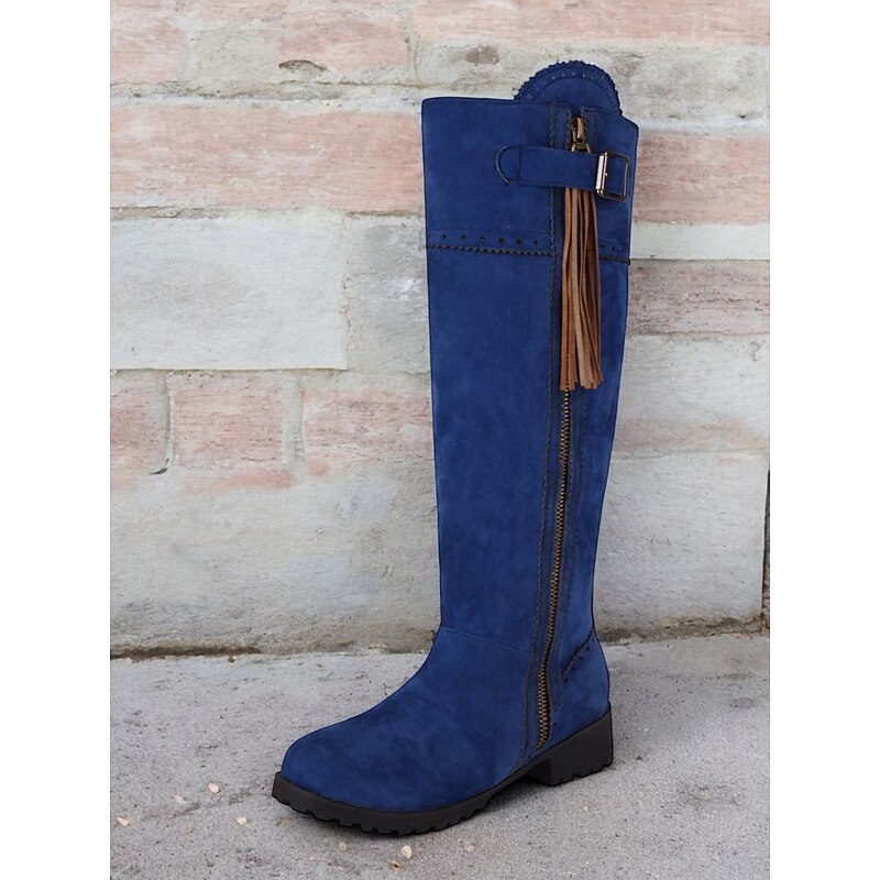 Women's Blue Faux Suede Knee-High Boots with Side Zipper and Tassel Detail, Vintage Style for Fall and Winter Casual Wear