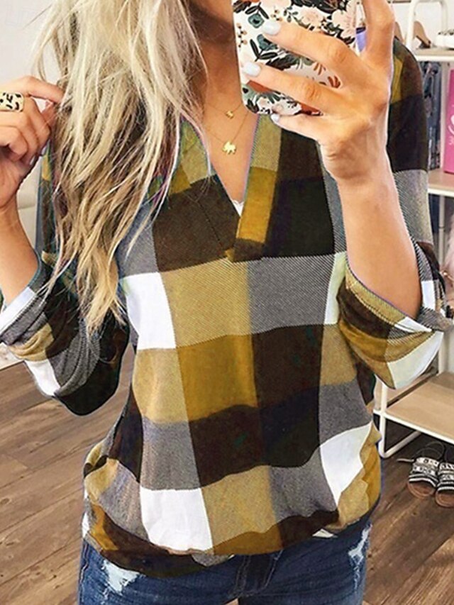 Women's Shirt Blouse Plaid Modern Casual Long Sleeve V Neck Regular Tops Holiday Going out Yellow Red Purple Orange Green Fall 7