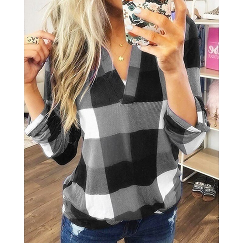 Women's Shirt Blouse Plaid Modern Casual Long Sleeve V Neck Regular Tops Holiday Going out Yellow Red Purple Orange Green Fall 11