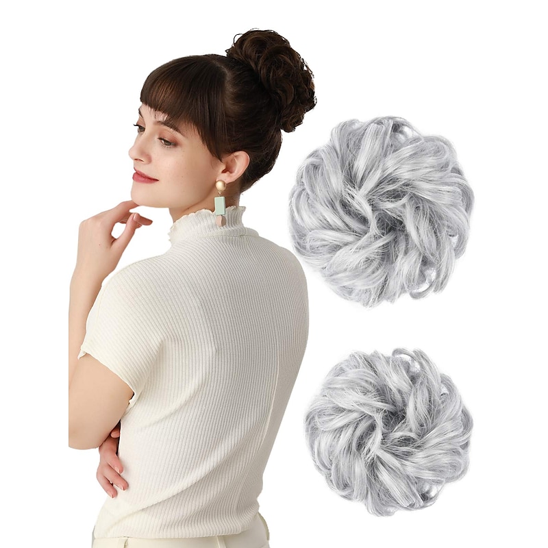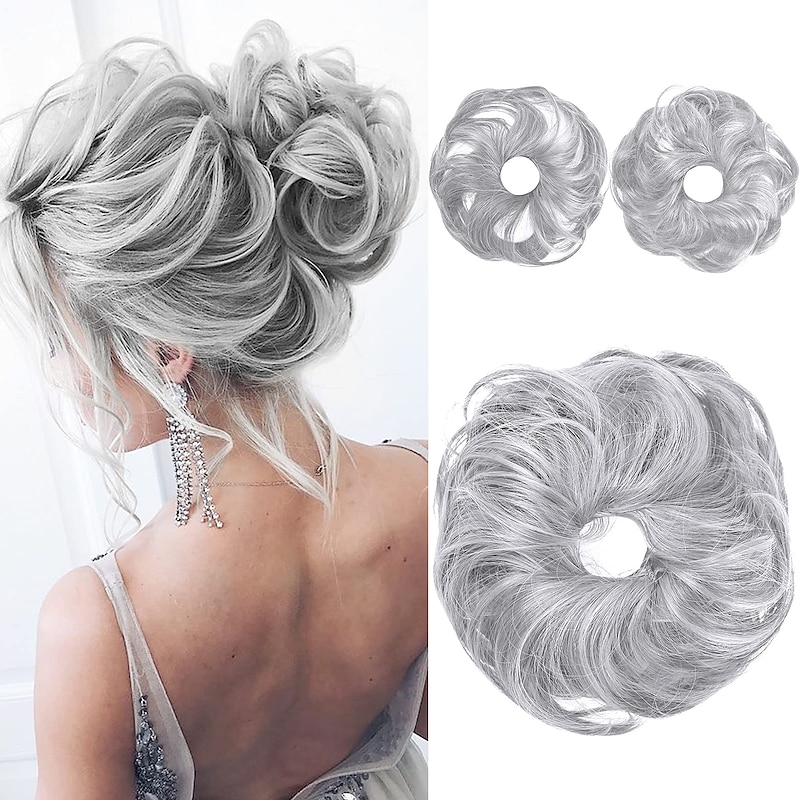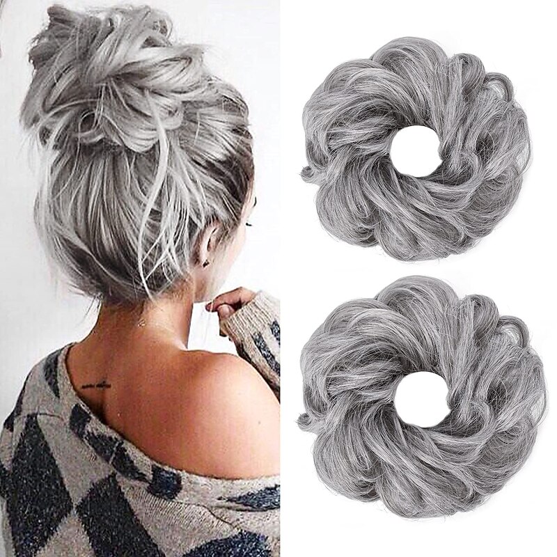 HOT ! 2PCS Updo Messy Hair Bun Curly Wavy Ponytail Extensions Hairpieces Hair Scrunchies Wraps Chignon for Women Girls (Plus Limited Hair Bun with Longer Hair Length Grey/Brown/Silver/White Mixed)