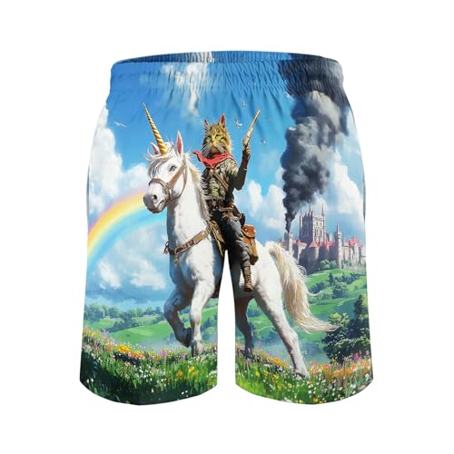 HOT ! Men's Funny Cat Riding Unicorn with Gun Swim Trunks Boardshort Beach Shorts