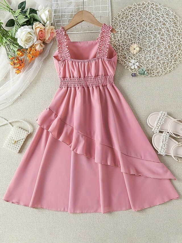 Girls Shirred Waist Ruffle Trim Cami Dress For Party Beach Vacation Kids Summer Clothes 1