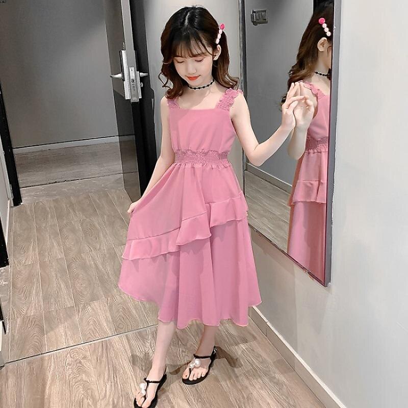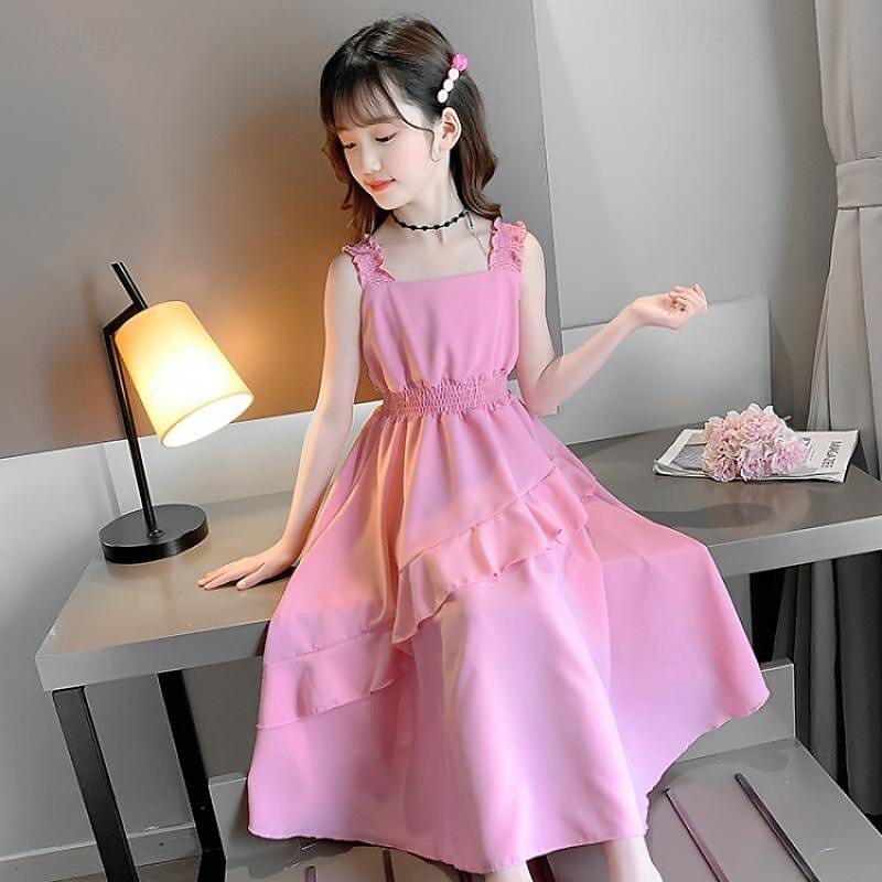 Girls Shirred Waist Ruffle Trim Cami Dress For Party Beach Vacation Kids Summer Clothes 9