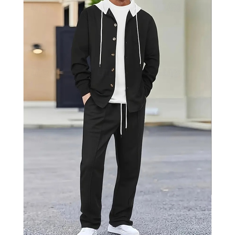 Men's Lightweight Jacket Waffle Jacket Casual Jacket Set Vacation Daily Breathable Pocket 2 Piece Spring Fall Color Block Fashion Classic Hooded Regular Black White Khaki Gray Jacket 1