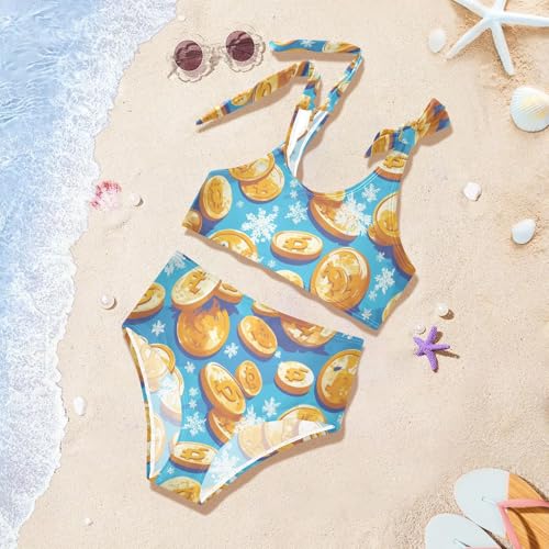 HOT ! KLL Flying Bitcoins and Snowflakes Girls' 2 Piece Bikini Set Scoop Neck Swimsuits Swimwear Adjustable Strap