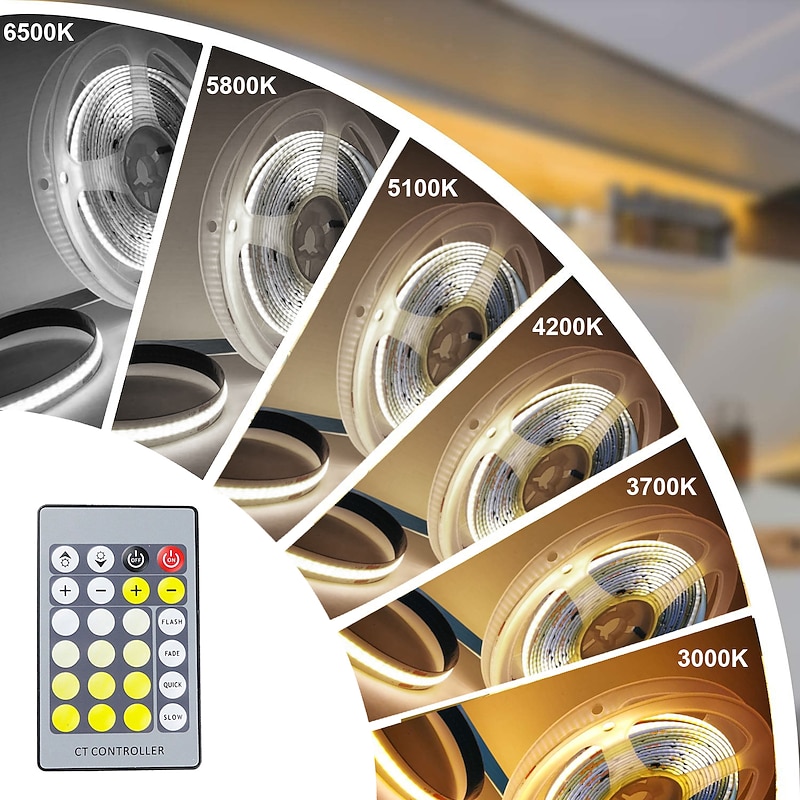 16.4ft Cob Flexbile Neon LED Strip Light Waterproof IR24 Key Controller with 24V Adapter Warm Cold White for Cabinet Bedroom Kitchen TV Mirror 5