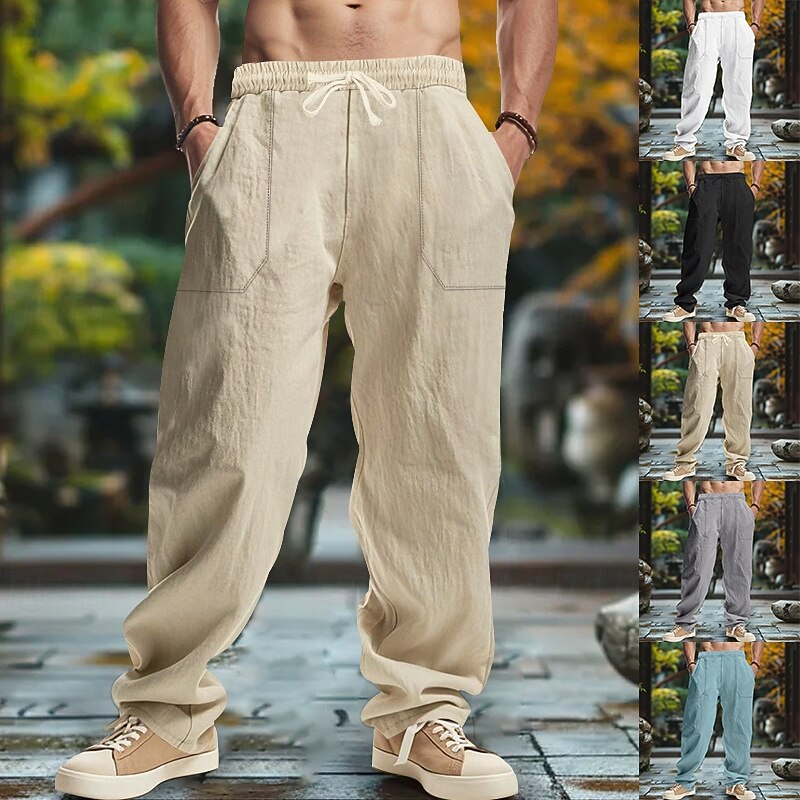 Men's Linen Pants Trousers Summer Pants Baggy Pants Beach Pants Drawstring Elastic Waist Straight Leg Plain Comfort Breathable Full Length Outdoor Yoga Gym Fashion Retro Vintage Black White 9