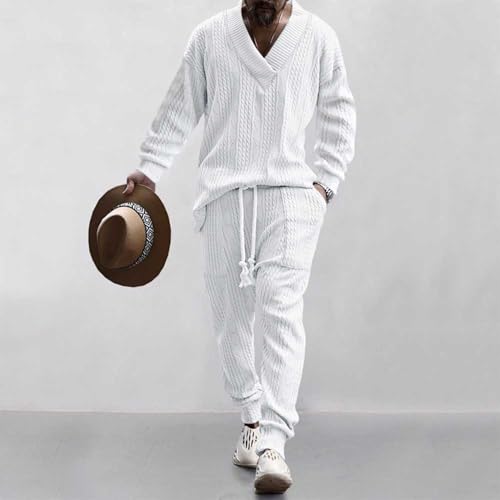HOT ! Athleisure Cable Jacquard Set Men,Men's Tracksuits V-Neck Long Sleeve Tops and Drawstring Jogging Pants Suit 2 Piece