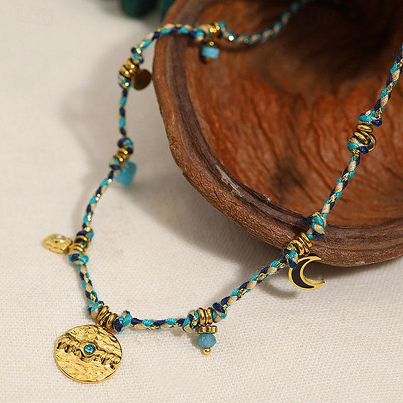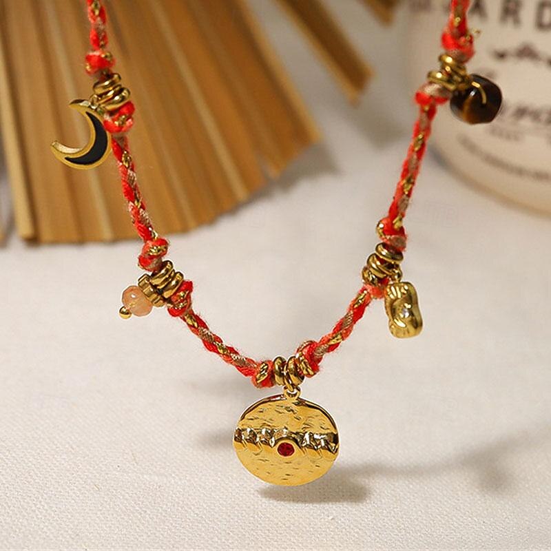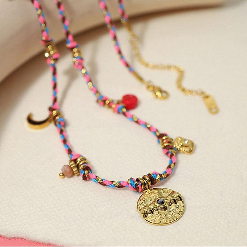 : This bohemian-style necklace is crafted from high-quality alloy, ensuring durability and a vintage, luxurious feel. The vibrant, multicolored braided cords add a lively touch, complementing the gold-toned pendants and charms, and bringing warmth and energy to the piece.