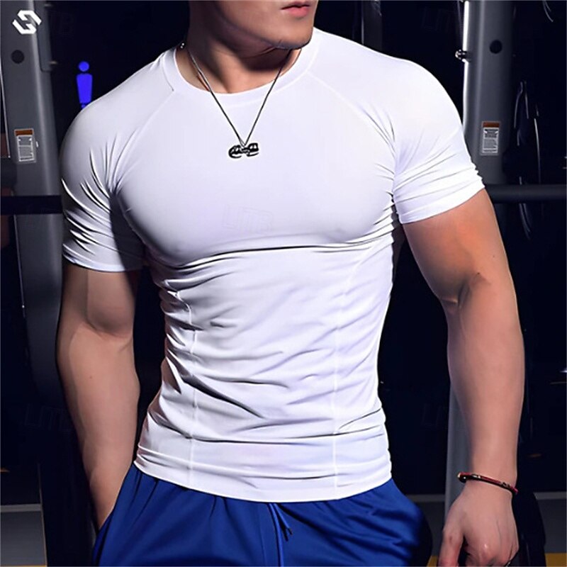 HOT ! Men's Gym Shirt Compression Shirt Fitness Shirt Crew Neck Short Sleeves Casual Daily Gym Quick dry High Stretch Sweat wicking Patchwork Color Block Black White Hot Stamping Activewear Polyester