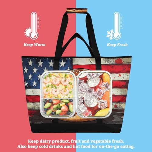 HOT ! Hamburger American Flag Large Insulated Tote Bag for Grocery Shopping Reusable Tote Bags for Women Men, Cooler Bag with Zippered Top & Handles for Beach Picnic Travel