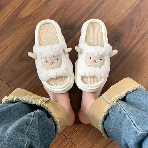 HOT ! Cute Lamb Slippers Soft Linen Slippers Animal Sheep Summer Cotton Linen Couple's Home Shoes Indoor and Outdoor Open Toe Non-Slip Mute Slippers(8-8.5(240mm), White)
