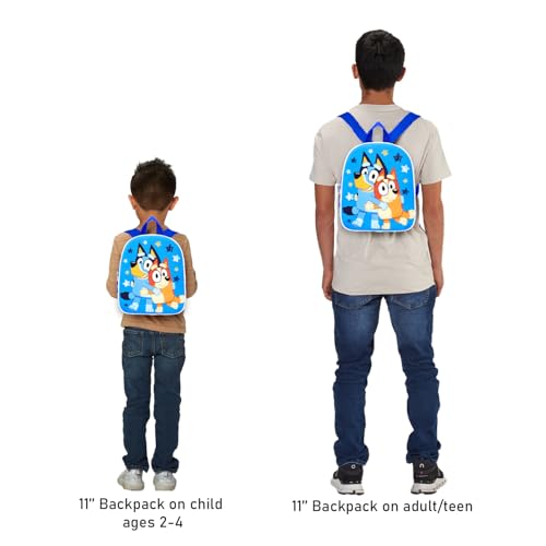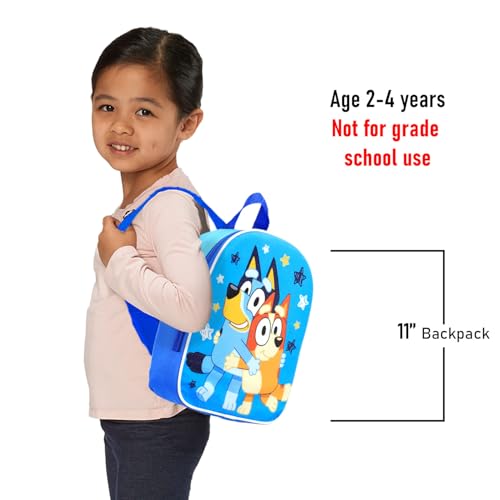 • Bluey school bag bundle includes one 11" mini backpack with adjustable shoulder straps and top loop for hanging and one insulated lunch box, each featuring colorful artwork of Bluey and Bingo.