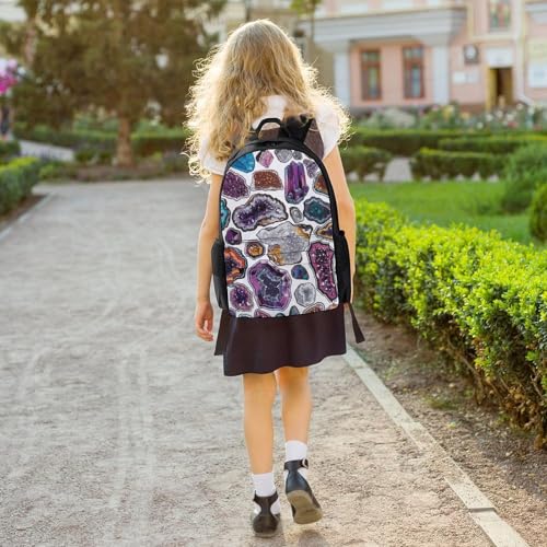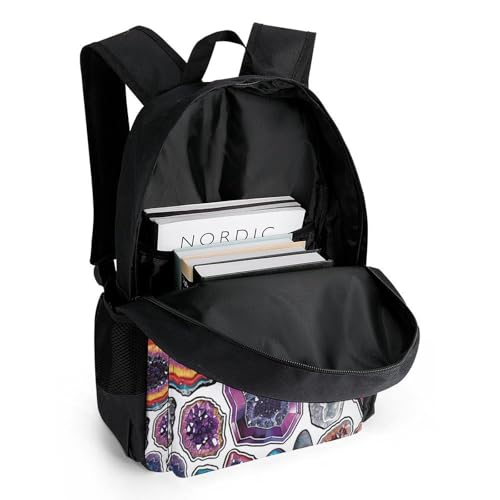 Large Dimensions: Geodes And Rocks Print Casual Bag Dimensions 12.6 x 6.7 x 16.1, large compartment in notepads, magazines, suitable for daily leisure, camping, work, and as a carry-on for flights.The casual daypack is suitable for women and men.Premium Quality Fabric: Lightweight backpack is made of durable and high-quality polyester. And its fabric has good softness and durability for long-term use. The backpack is designed with a sturdy two-way zipper for smoother and more flexible opening and closing. Adjustable padded shoulder straps are plush to carry.Large Storage Space: Travel backpack has large -capacity main pocket x1, front zipper pocket x1, side pocket x2.The spacious compartments and multiple pockets make your items well-organized and easier to find.Pocket for keys, tissues.There are also two water bottle holders that can be used to hold water bottles and umbrellas.Durable Backpacks: Lightweight aesthetic backpack is made of breathable polyester to avoid being wet by rain, easy to clean, even if it is dirty, it can be wiped gently with a wet paper towel.Fully protect your belongings from accidental knocks and scratches.Exquisite And Comfortable: Fashionable and retro design bag with neat work on each details, can protect belongings from outside damage, ensure a secure & long-lasting usage everyday .Broad soft adjustable shoulder straps easy to carrying with perfect fit, this backpack can stand up for several years of use. Perfect for everyday use. first-class materials and excellent craftsmanship ensure long-lasting durability.