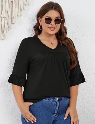 Micoson Womens Plus Size Tops 3/4 Ruffle Sleeve Shirt Casual V Neck Pleated T Shirt Loose Fit Tunic Blouse(1X-5X) 3