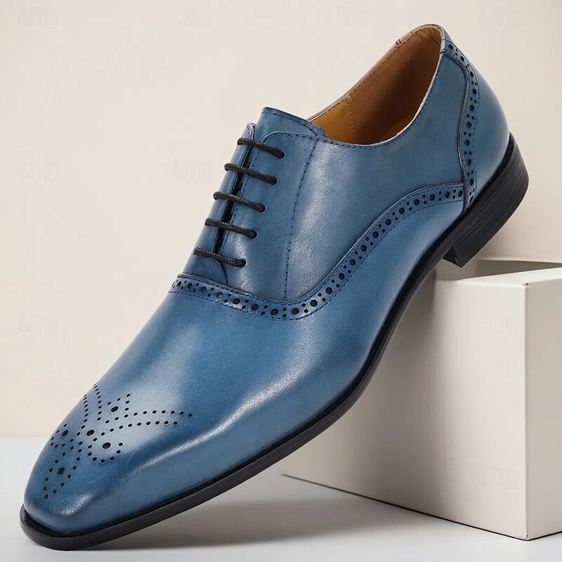 HOT ! Men's Blue Genuine Cowhide Leather Brogue Dress Shoes – Classic Lace-Up Shoes for Formal Events, Business and Weddings