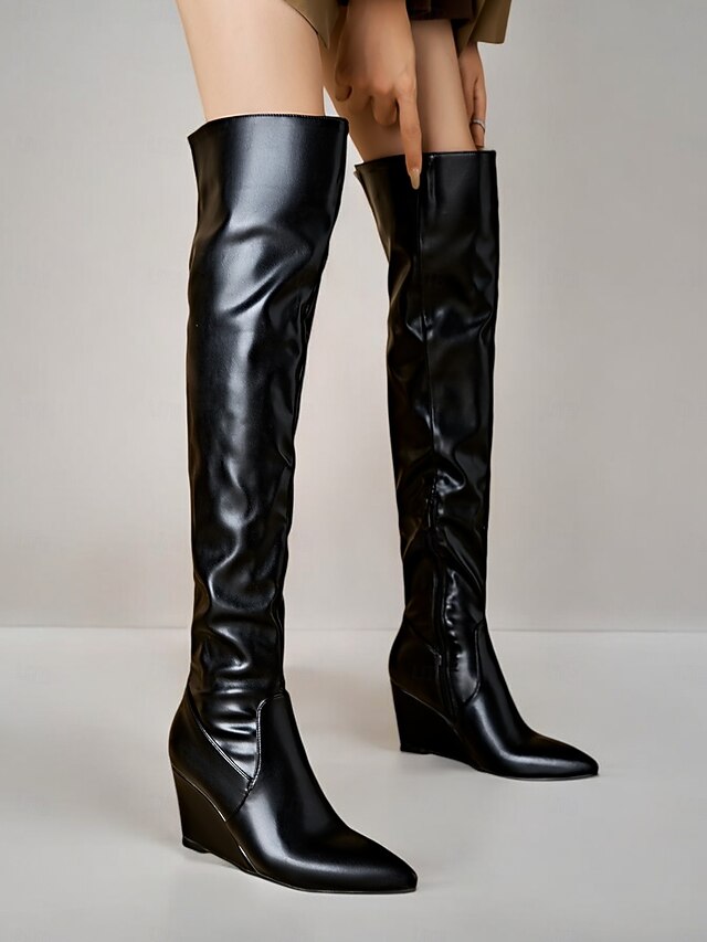 Women's Black Over-the-Knee Wedge Heel Boots – Sleek Faux Leather, Pointed Toe, Winter Fashion for Casual or Night Out 1