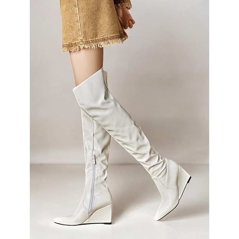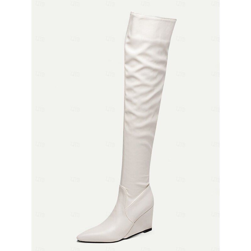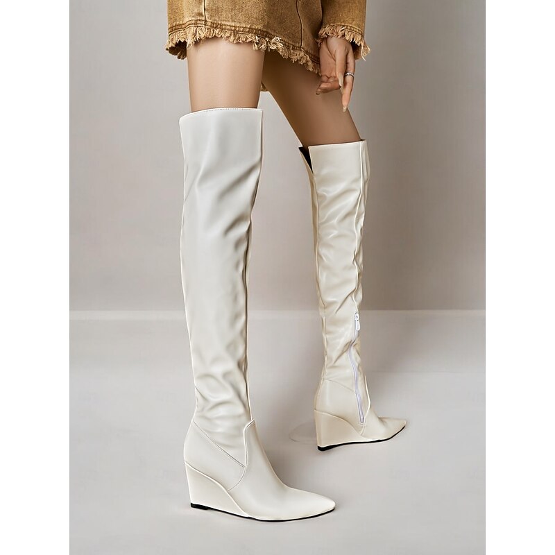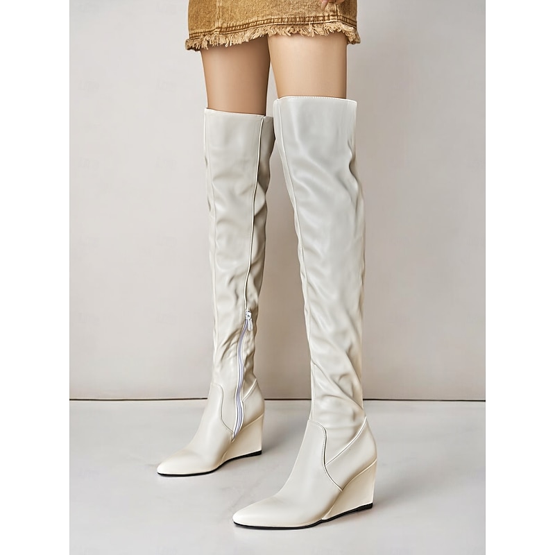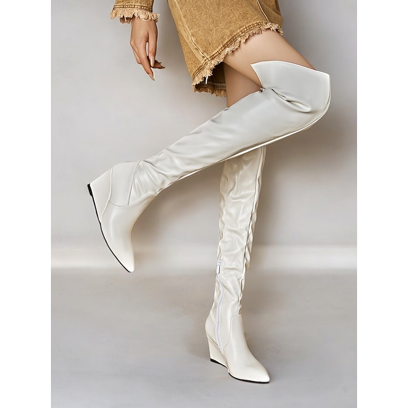 Highlights [Fabric] : Crafted from high-quality PU and lined with synthetic leather and textile, these over-the-knee boots boast a luxurious, glossy finish that enhances their sophisticated allure. The durable rubber outsole ensures lasting wear through the seasons. [Style] : These boots offer a sleek, fitted silhouette that complements the natural shape of the leg. The pointed toe design adds a modern touch, while the sculptural wedge heel provides both height and comfort for a fashionable look. [Design Highlights] : Featuring a convenient side zipper embellishment for easy on and off, these boots are a perfect blend of style and practicality. The sculptural heel and pointed toe create a contemporary and elegant aesthetic, making these boots a standout addition to your wardrobe. [Occasions] : Ideal for daily use, work, or a night out, these versatile boots are suitable for a range of occasions, from casual gatherings to more formal events. Their chic design adds a fashionable touch to any outfit, whether dressed up or down. [Size Notice] : Available in a range of sizes from US5.5 to US10.5, these boots are standard-sized, so it is recommended to select your usual size for the perfect fit.