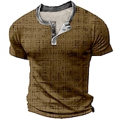 Highlights [Fabric] : Crafted from lightweight and breathable polyester, this men's Henley tee offers a micro-elastic fit that ensures comfort and ease of movement, perfect for warm summer days. [Fit] : Designed in a regular fit, this shirt contours slightly along the torso to provide a flattering silhouette while allowing for ample flexibility and comfort. [Design Highlights] : Featuring a textured waffle weave pattern with a stylish graphic print, the shirt includes a classic Henley neckline with a three-button placket for adjustable comfort. The contrasting collar adds a touch of sophistication, enhancing its modern appeal. [Occasions] : Ideal for daily wear, casual outings, and outdoor activities, this versatile tee can be easily paired with jeans or chinos for a relaxed yet stylish look. It's perfect for enhancing your wardrobe with designer flair. [Size Range] : Available in a wide range of sizes from S to 3XL, this shirt caters to various body types, ensuring a comfortable and tailored fit for everyone.