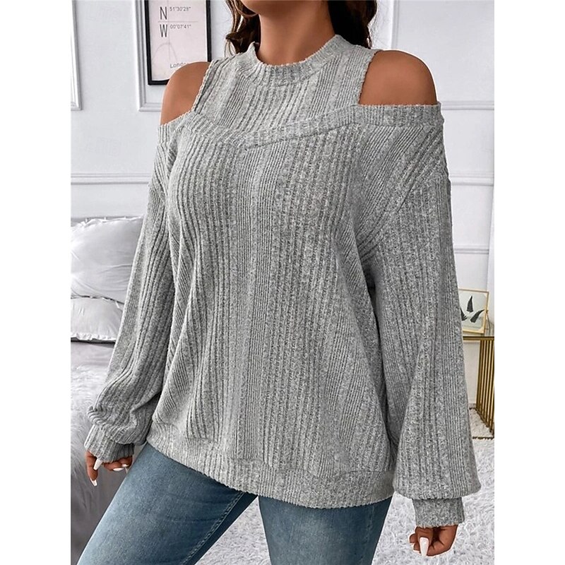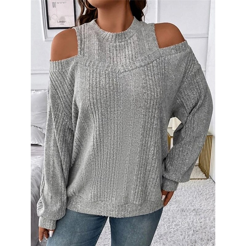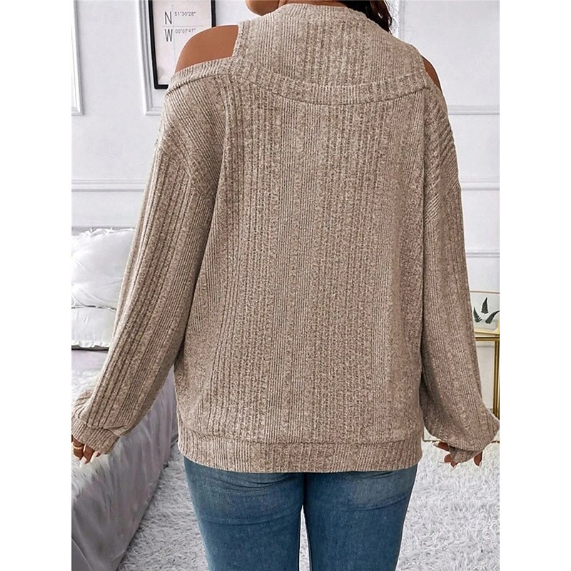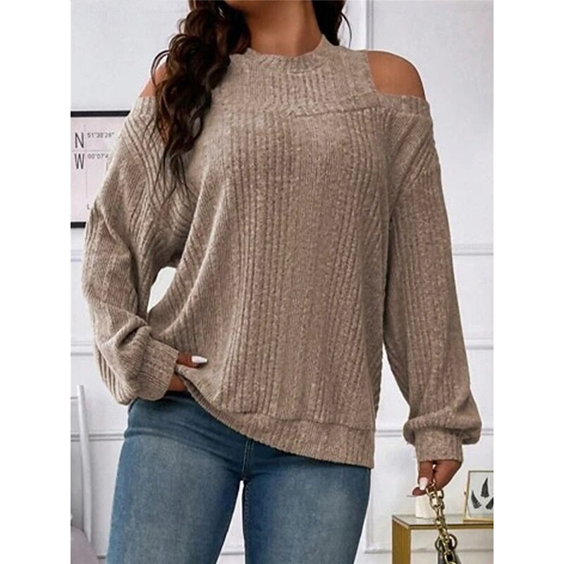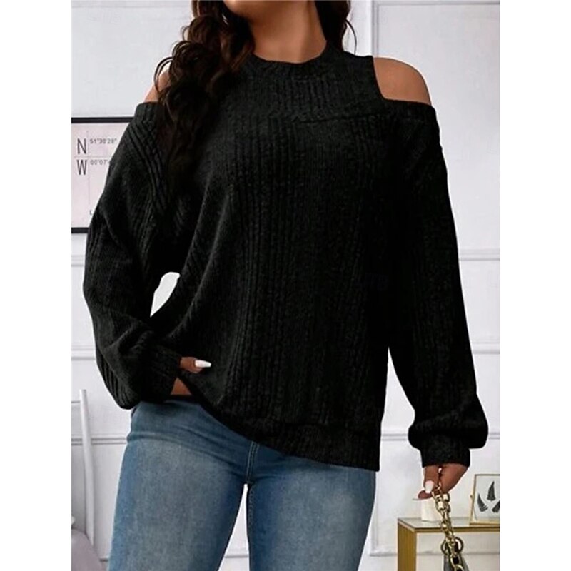 Highlights [Fabric]: Crafted from a soft and cozy polyester blend, this women's sweater offers both warmth and comfort, making it perfect for the fall and winter seasons. The ribbed knit adds texture and a classic touch. [Fit]: Featuring a loose fit, this pullover sweater provides a relaxed silhouette, flattering for various body types while ensuring maximum comfort throughout the day. [Design Highlights]: The sweater's chic cold-shoulder design and crew neck add a modern flair, while the striped pattern enhances its visual appeal. It's perfect for layering, offering versatility in styling. [Occasions]: Ideal for daily activities, outdoor adventures, weekend outings, and casual gatherings. Pair it with jeans or tailored pants for a look that transitions seamlessly from casual days to more formal settings. [Size Range]: Available in sizes S, M, L, XL, and 2XL, catering to a wide range of women ensuring a perfect fit for everyone seeking style and comfort.