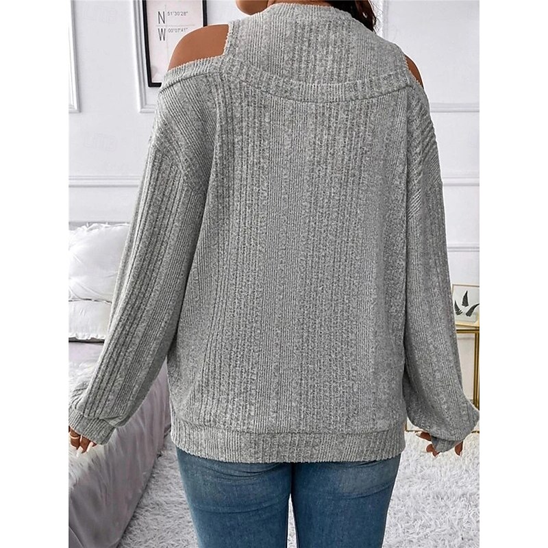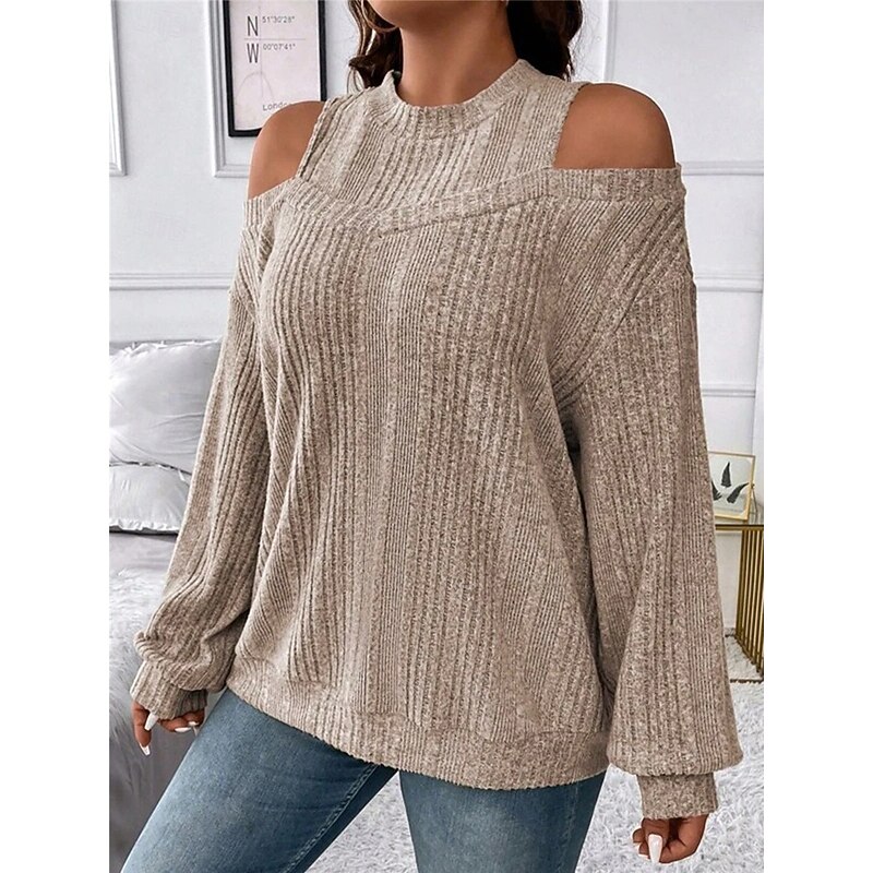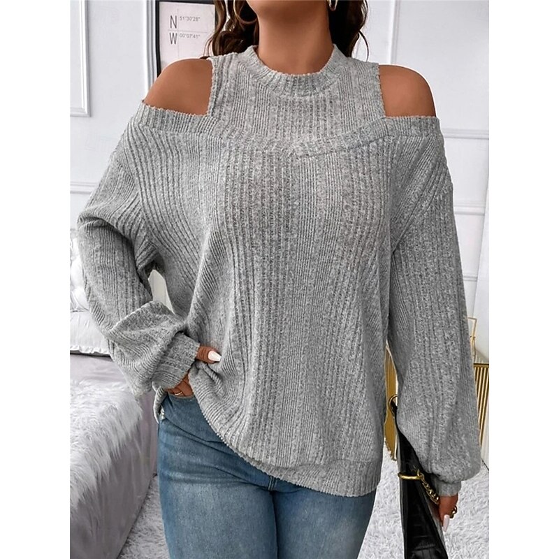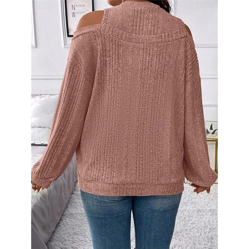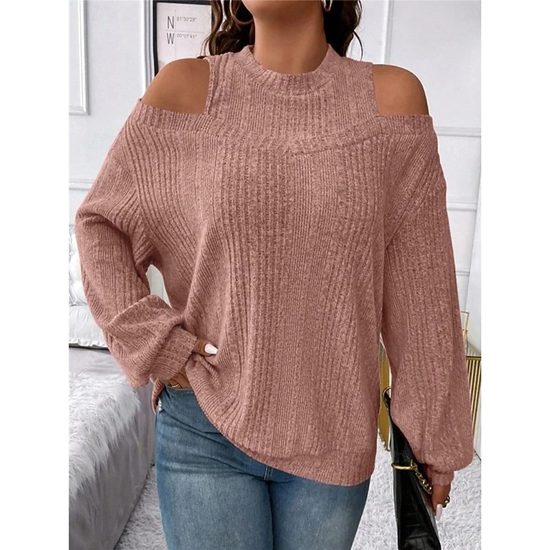 Highlights [Fabric]: Crafted from a soft and cozy polyester blend, this women's sweater offers both warmth and comfort, making it perfect for the fall and winter seasons. The ribbed knit adds texture and a classic touch. [Fit]: Featuring a loose fit, this pullover sweater provides a relaxed silhouette, flattering for various body types while ensuring maximum comfort throughout the day. [Design Highlights]: The sweater's chic cold-shoulder design and crew neck add a modern flair, while the striped pattern enhances its visual appeal. It's perfect for layering, offering versatility in styling. [Occasions]: Ideal for daily activities, outdoor adventures, weekend outings, and casual gatherings. Pair it with jeans or tailored pants for a look that transitions seamlessly from casual days to more formal settings. [Size Range]: Available in sizes S, M, L, XL, and 2XL, catering to a wide range of women ensuring a perfect fit for everyone seeking style and comfort.