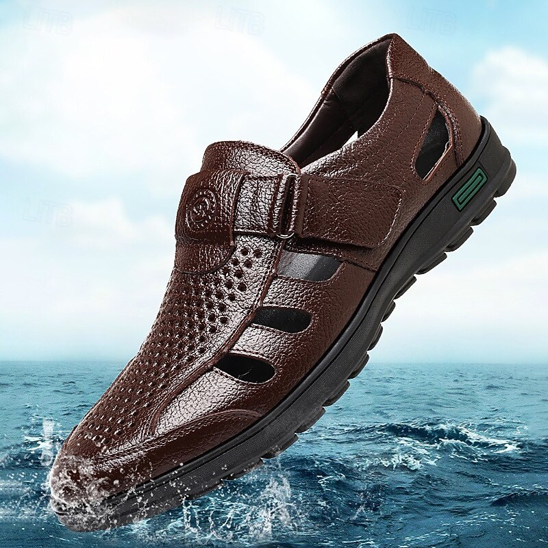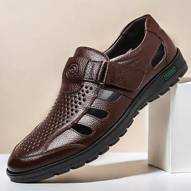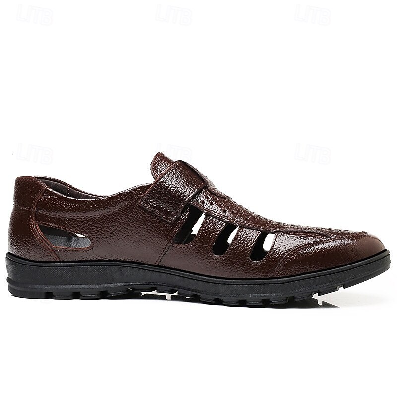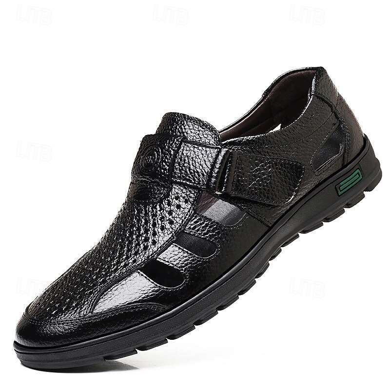 HOT ! Men's Black Faux Leather Sandals – Breathable Cut-Out Design with Adjustable Strap, Comfortable Summer Shoes for Casual and Outdoor Wear