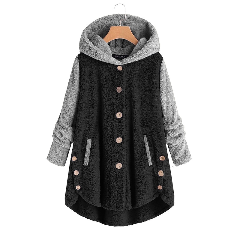 Highlights [Fabric] : Crafted from a cozy combination of fleece, flannel, and sherpa, this women's jacket offers a soft, fuzzy texture that is perfect for the colder months. The micro-elasticity ensures a comfortable fit while retaining warmth, making it an ideal choice for both fall and winter. [Silhouette] : Designed with a regular fit, this jacket features a long-fitted style that provides a flattering silhouette for all body types. The slightly extended hem at the back adds a subtle touch of elegance. [Design Highlights] : The jacket boasts a unique color block design with a stylish hood and two-tone contrast between the soothing blue main body and the sleek grey sleeves and hood. The classic button-down front is enhanced with wooden buttons, which impart a rustic charm. Additionally, it includes two handy front pockets, perfect for keeping your essentials accessible and your hands warm. [Occasions] : This casual jacket is ideal for street and casual scenarios, providing both warmth and style. Whether you're heading out for a casual walk or layering up for a chilly day, this jacket's trendy aesthetic ensures you look chic and feel comfortable. [Size Range] : Available in a wide range of sizes from S to 5XL, this jacket caters to diverse body shapes and preferences, ensuring everyone can find their perfect fit.