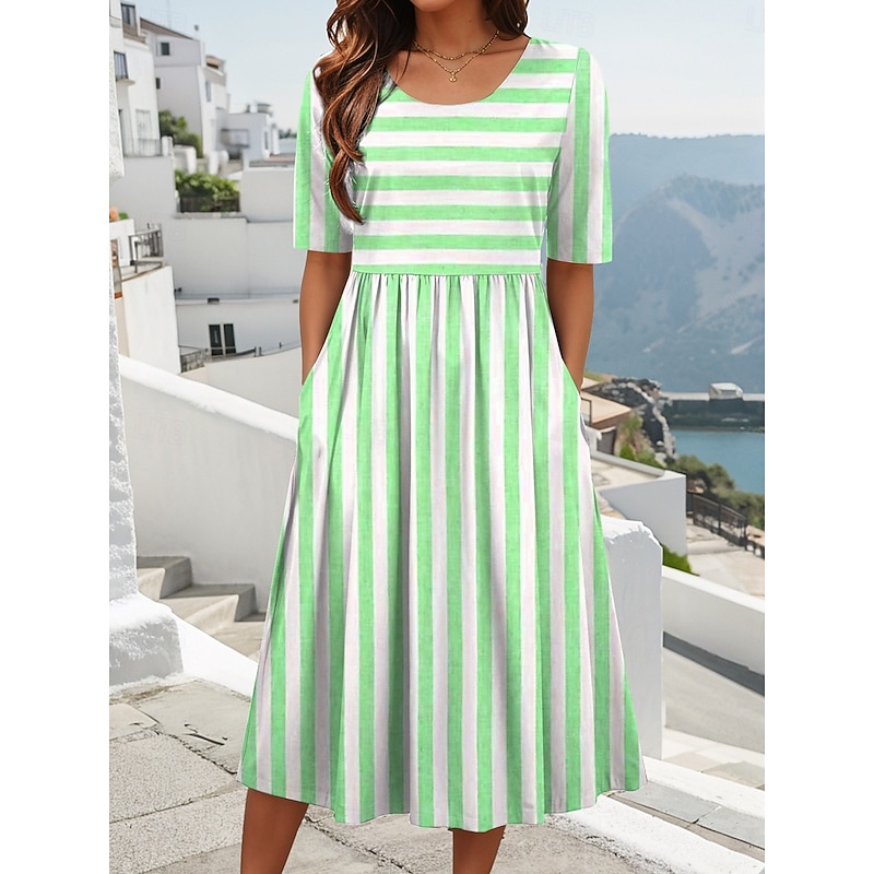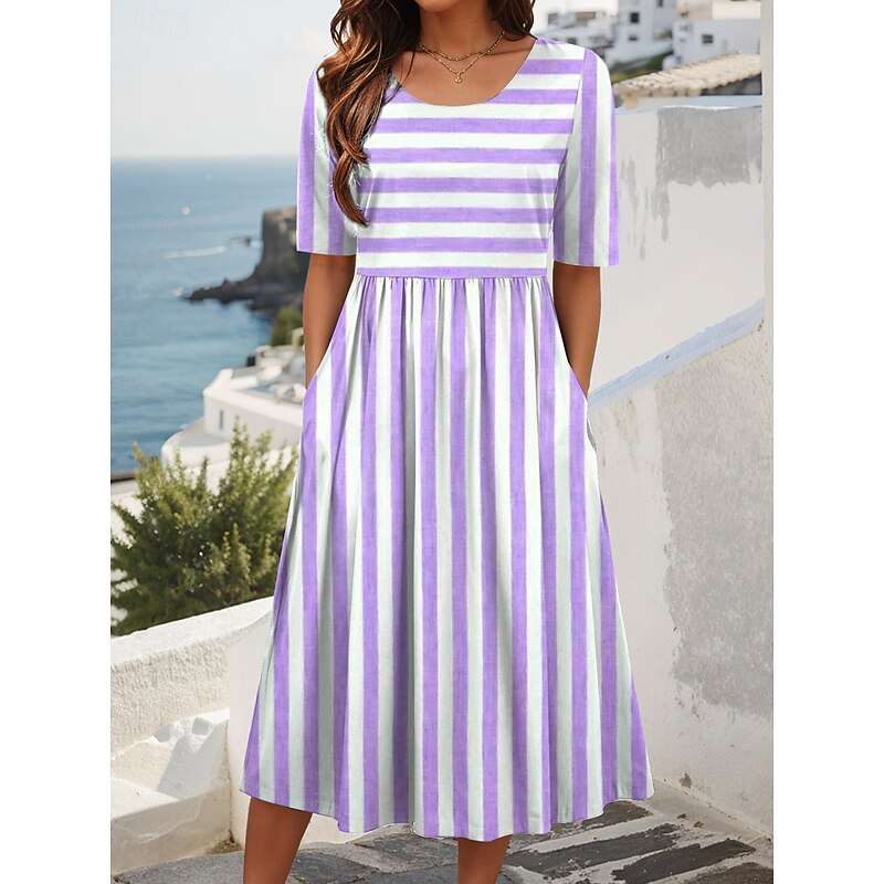 HOT ! Women's Midi Dress Summer Dress Pleated Dress Vacation Casual Holiday Loose Fit Graphic Striped Half Sleeve Crew Neck Light Green Pink Blue Purple Summer