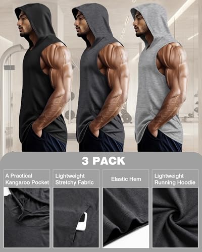3 Pack Men's Big & Tall Workout Hooded Tank Tops, Cotton Sleeveless Gym Hoodies Bodybuilding Muscle Cut Off Shirts 3