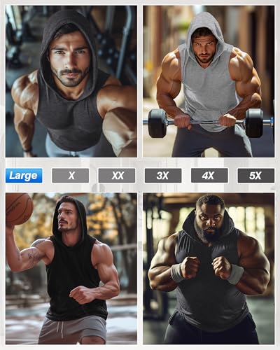 3 Pack Men's Big & Tall Workout Hooded Tank Tops, Cotton Sleeveless Gym Hoodies Bodybuilding Muscle Cut Off Shirts 5