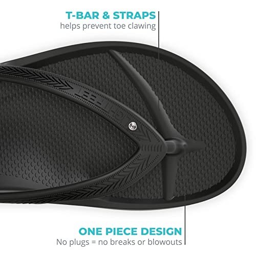 • BLACK FLIP FLOPS FOR WOMEN WITH BLING DESIGNED IN AUSTRALIA - The high arch support aids common overuse conditions like flat feet & plantar fasciitis. The deep heel cup supports your heel, ankle and foot for maximum efficiency. The result is the most comfortable arch support flip flops with rhinestones you’ve ever worn! Perfect flip flops for the beach and walking.