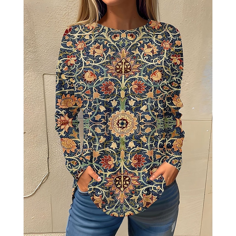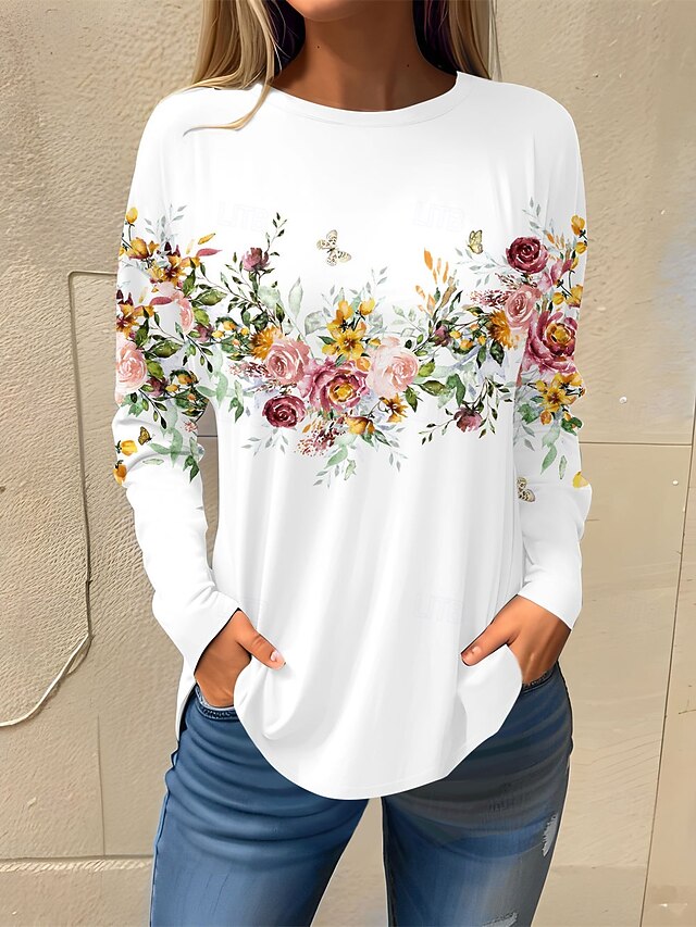 Women's T shirt Long Sleeve Basic Floral Print Long Sleeve Regular Tops Round Neck Holiday Weekend White Pink Red Navy Blue Blue Fall & Winter Prefall 24