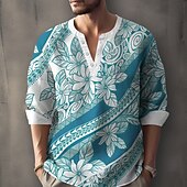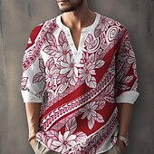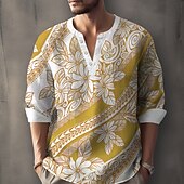 Men's Polynesian Tribal Floral Print Shirt Henley Shirt Tunic Shirts Long Sleeve Vintage Retro Outdoor Vacation Daily Summer Spring V Neck Button Up 3D Print Linen Like Shirt Yellow Red Blue 3