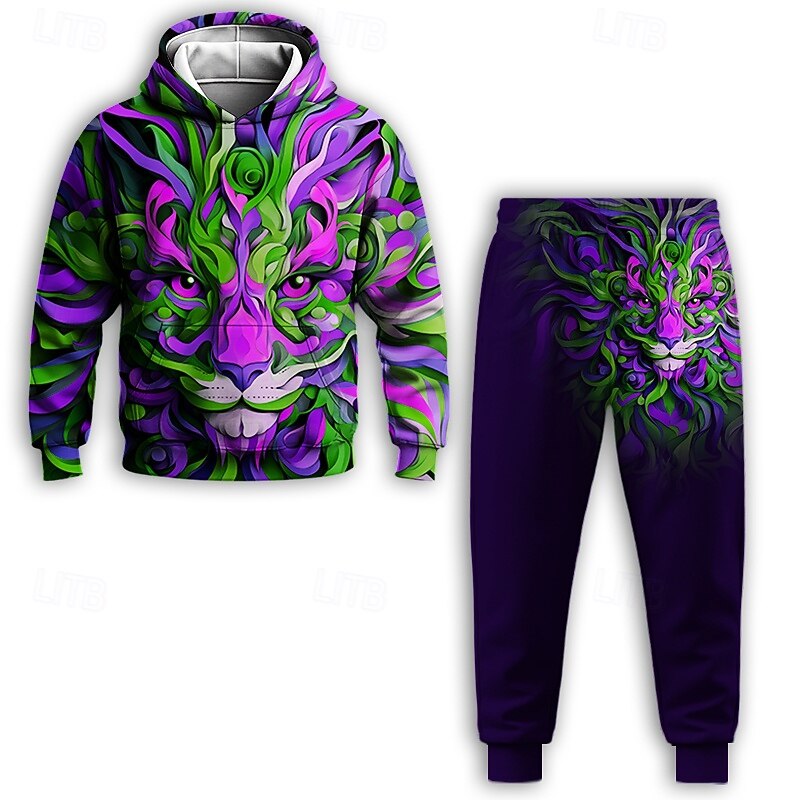 Boys 3D Graphic Animal Lion Hoodie & Sweatpants Set Sports Suit Tracksuits Long Sleeve Spring Fall Daily Basic Casual Kids 4-12 Years Hooded Outdoor Vacation Sports Tailored Fit 2