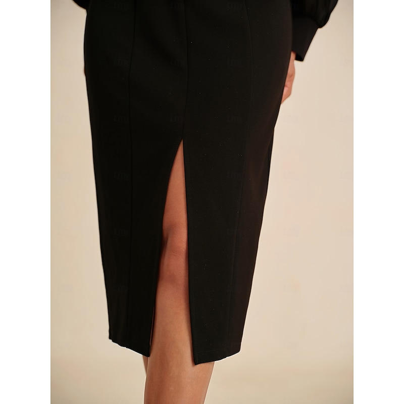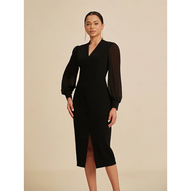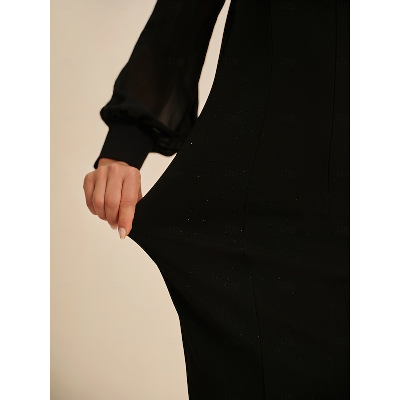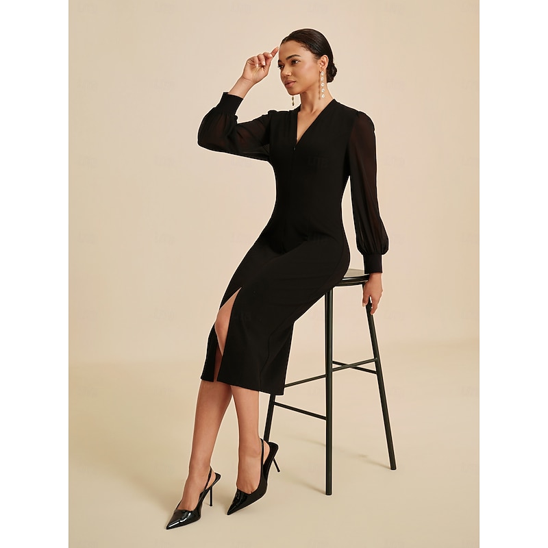 More information about Women's Midi Dress Black Long Sleeve V Neck Fitted Silhouette Stretch Glitter Sheer Mesh Panel Concealed Zipper Elegant All Seasons